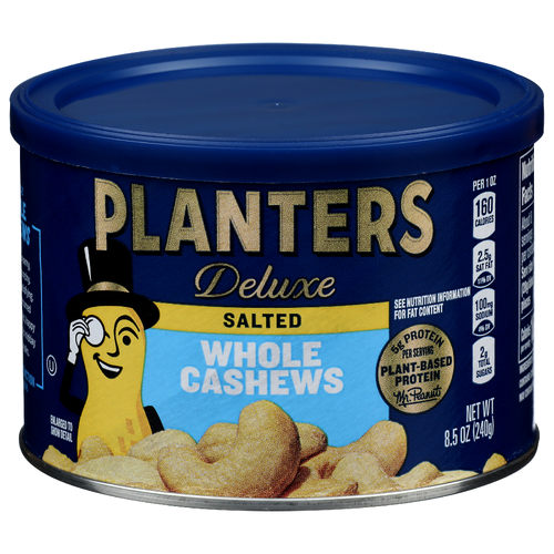 Planters Deluxe Whole Cashews deliver the rich flavor and crunchiness that makes you crave just one more handful. Roasted in peanut oil and finished with sea salt for great taste, these roasted cashews have an enjoyable crispy texture. A convenient on-the-go snack, these roasted nuts are also comforting when you want to relax at the end of a busy day. This 8.5 ounce canister of nuts is Kosher-friendly, sealed for freshness and has a fulfilling 160 calories per 1 ounce serving. These roasted cashews help curb hunger and give you an energy boost during a work break or after exercising.Product Number: 00029000016132